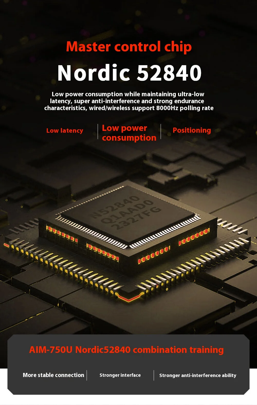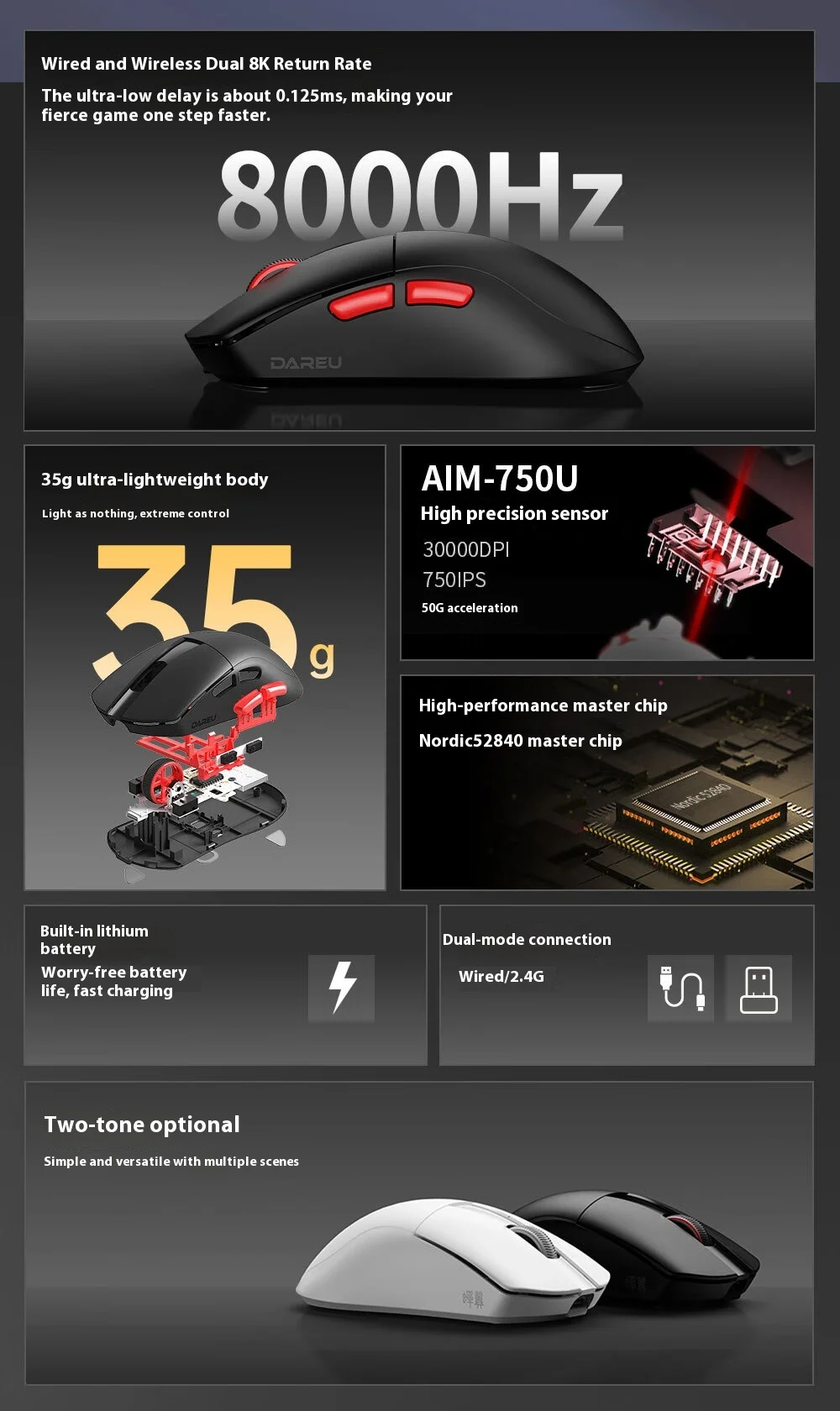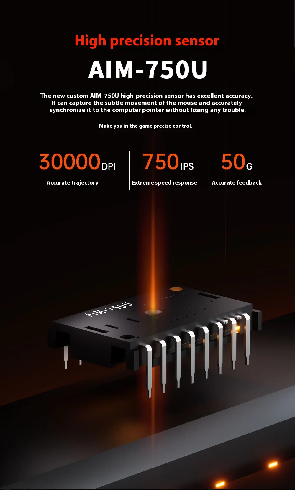 High-precision sensor (AIM-750U) supporting 30,000 DPI, 750 IPS, and 50G acceleration for accurate tracking.