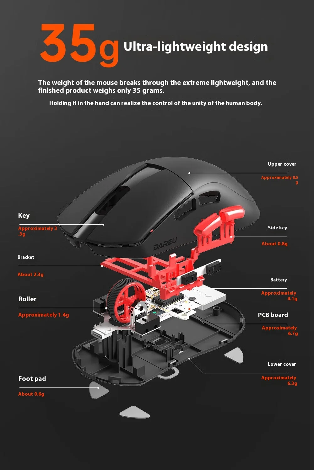 Ultra-lightweight design at 35g, ensuring agile and effortless control.