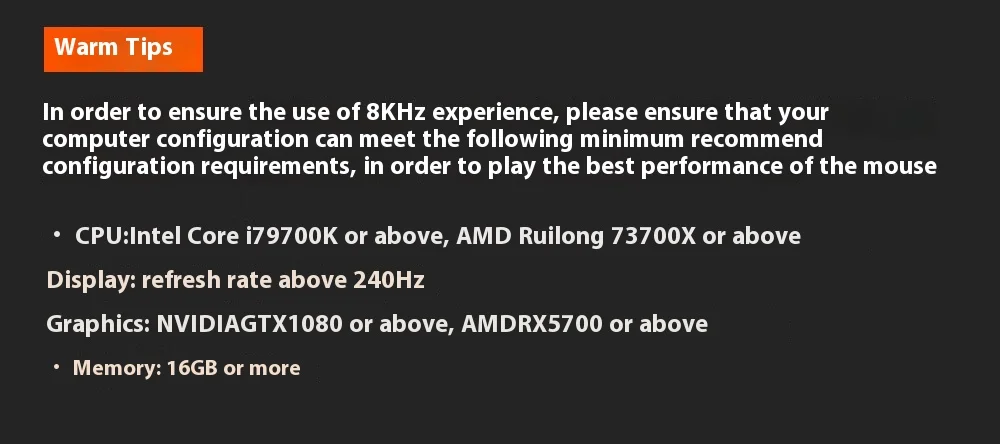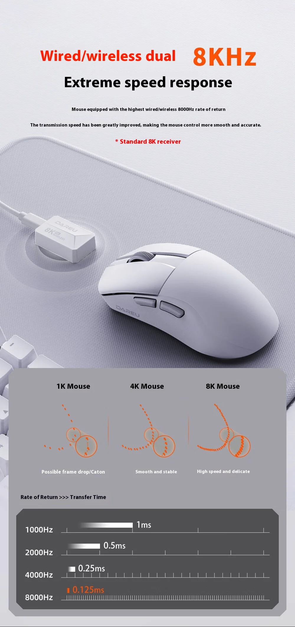 Dual wired + wireless modes with up to 8000Hz polling rate, offering ultra-low latency of 0.125ms, ideal for competitive gaming.
