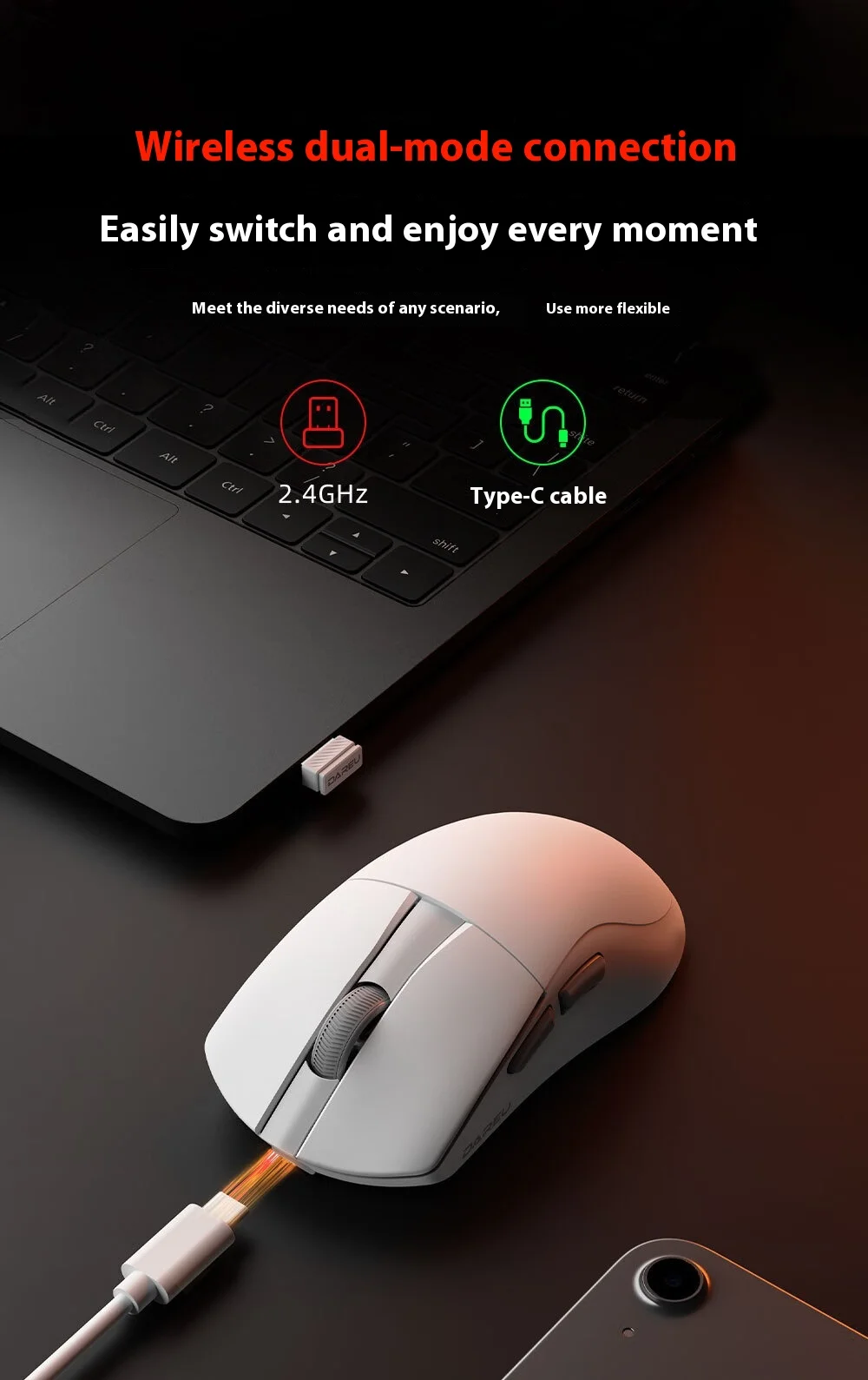 Dual connectivity modes: Supports both wired and 2.4GHz wireless connections for versatile use.
