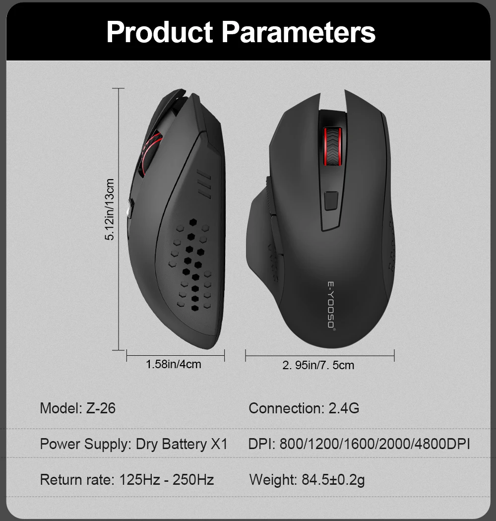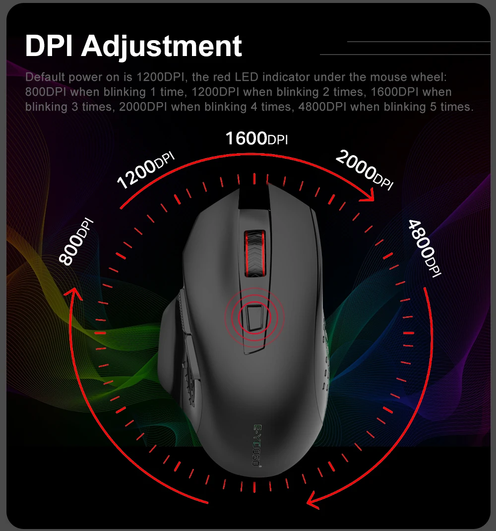 5-Level 4800 DPI & 2 Kinds Polling Rate : 5-level DPI settings (800/1200(default)/1600/2000/4800), choose your comfortable speed for working or gaming. X-26 will move more precise by 125Hz(default) or 250Hz polling rate: Press the right button + the middle buttom for 3 seconds to switch polling rate.